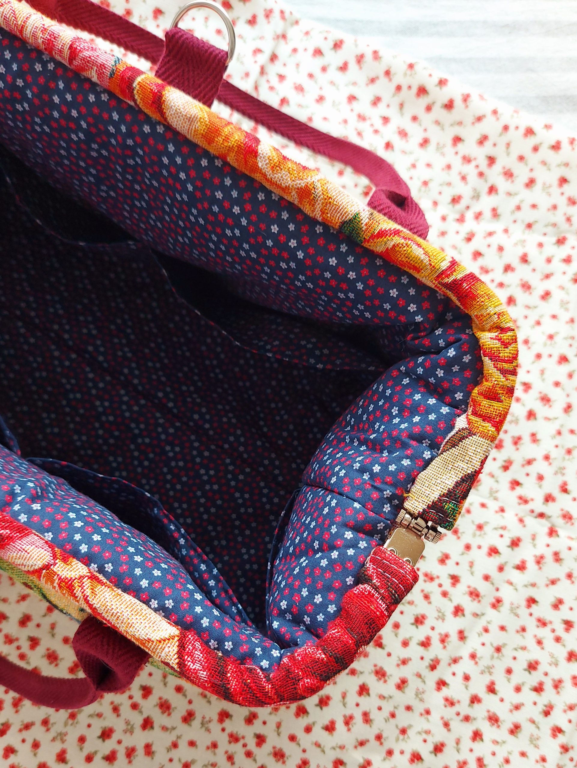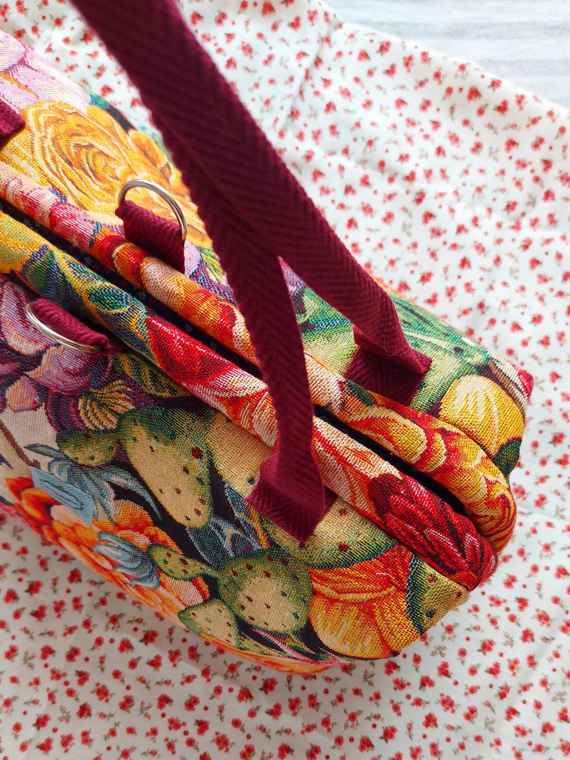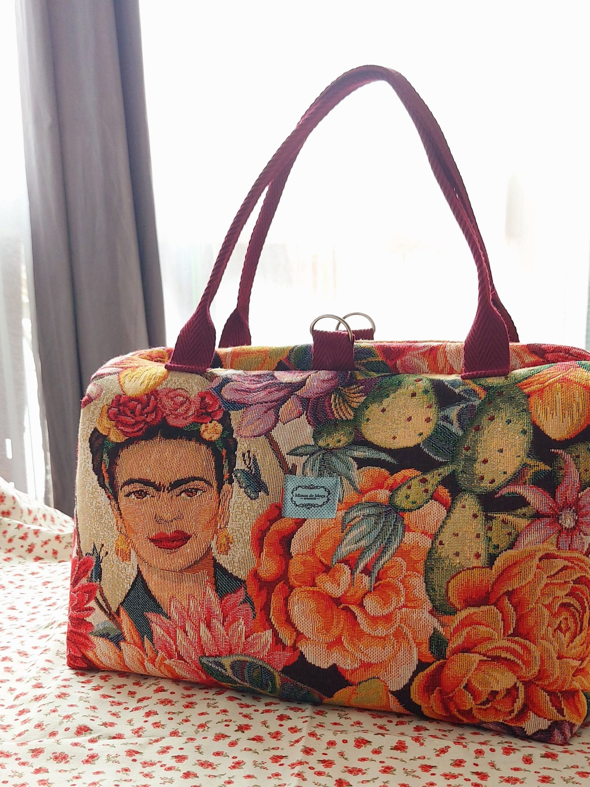 Con un precioso estampado inspirado en la pintora mexicana Frida Kahlo, con forro y asas en color burdeos, a juego con el estampado. Si deseas que las asas y el forro sea de otro color, por favor informar en el momento de la compra.